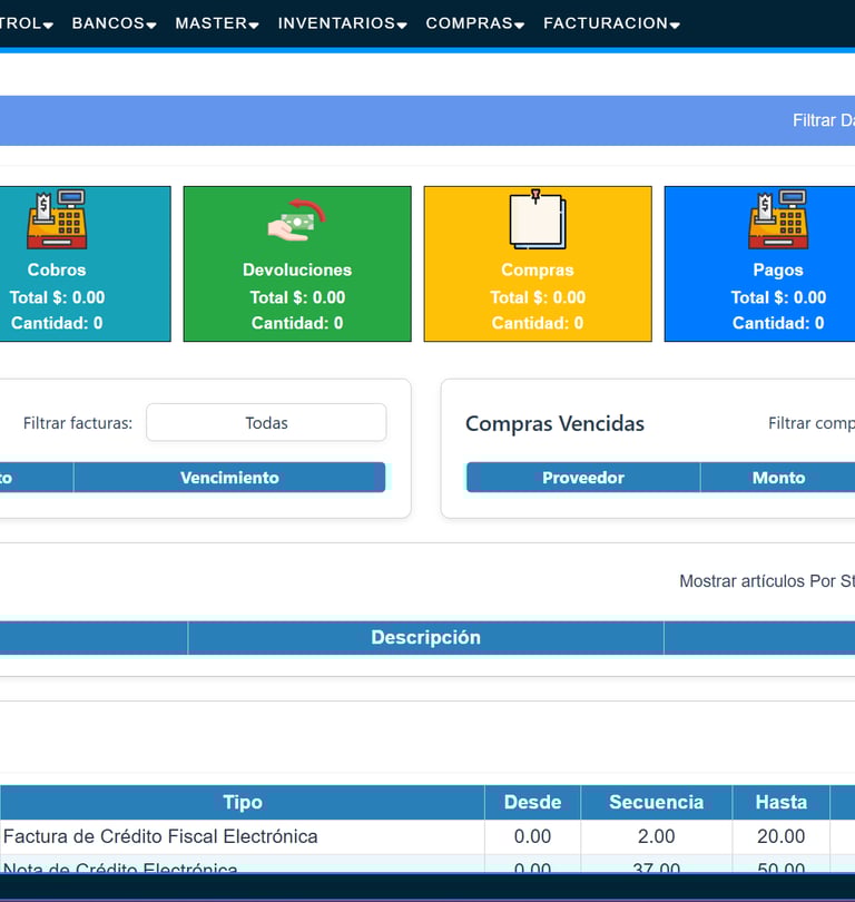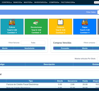 Tu vista general para tomar decisiones inteligentes. Desde este panel podrás ver al instante cuánto has vendido, cobrado, comprado y gastado. Controla devoluciones, pagos y más, todo en un solo lugar. Revisa tu inventario con códigos, descripciones y cantidades disponibles, y mantén al día la disponibilidad de tus NCF para una facturación sin sorpresas. Información clara, útil y al alcance de un clic.