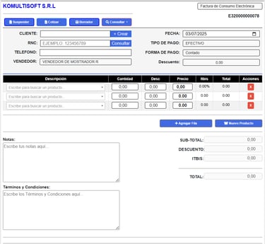 Genera y gestiona tus facturas de forma ágil y segura. Registra los datos clave del cliente como nombre, RNC y contacto. Elige el vendedor, define el tipo y forma de pago, aplica descuentos y personaliza con notas, términos y condiciones. Guarda, cancela o aplica pagos con total control. Todo lo que necesitas para una facturación profesional y sin complicaciones.